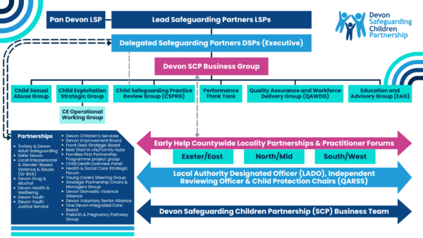The Devon SCP work with local subgroups, locality forums and have collaborative arrangements with the South West Peninsula Local Safeguarding Children Partnerships. They also commission work through task and finish groups with a named Partnership Member lead. Each sub-group Chair reports directly to the Partnership Executive (Delegated Safeguarding Partners).